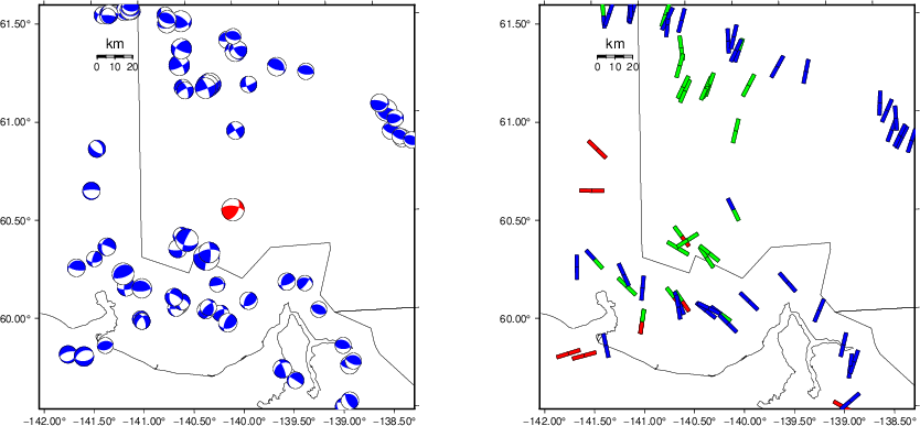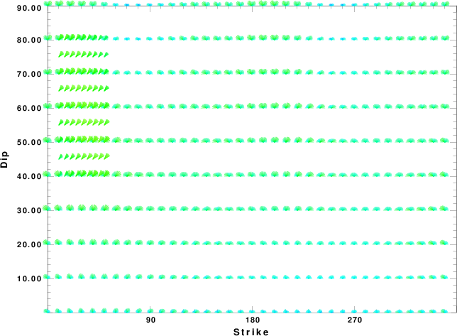 | Focal mechanism sensitivity at the preferred depth. The red color indicates a very good fit to the waveforms. Each solution is plotted as a vector at a given value of strike and dip with the angle of the vector representing the rake angle, measured, with respect to the upward vertical (N) in the figure. |