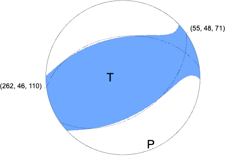 W-phase Moment Tensor (Mww) Moment 8.463e+16 N-m Magnitude 5.22 Mww Depth 11.5 km Percent DC 75% Half Duration 0.50 s Catalog US Data Source US Contributor US Nodal Planes Plane Strike Dip Rake NP1 262 46 110 NP2 55 48 71 Principal Axes Axis Value Plunge Azimuth T 7.851e+16 76 253 N 1.113e+16 14 68 P -8.964e+16 1 159 |