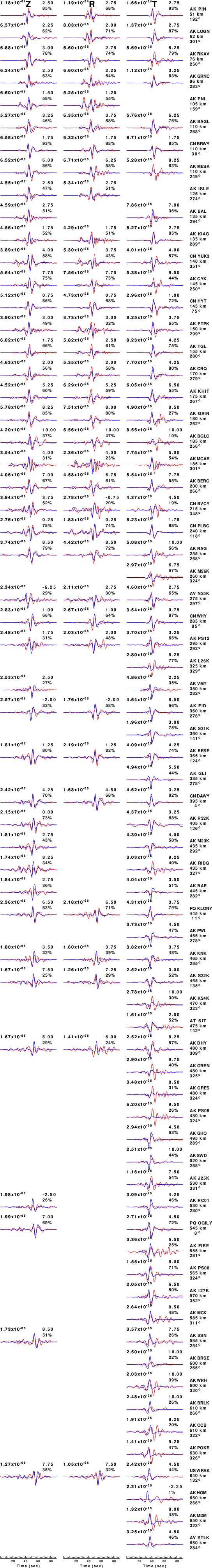 The comparison of the observed and predicted waveforms is given in the next figure. The red traces are the observed and the blue are the predicted. Each observed-predicted component is plotted to the same scale and peak amplitudes are indicated by the numbers to the left of each trace. A pair of numbers is given in black at the right of each predicted traces. The upper number it the time shift required for maximum correlation between the observed and predicted traces. This time shift is required because the synthetics are not computed at exactly the same distance as the observed, the velocity model used in the predictions may not be perfect and the epicentral parameters may be be off. A positive time shift indicates that the prediction is too fast and should be delayed to match the observed trace (shift to the right in this figure). A negative value indicates that the prediction is too slow. The lower number gives the percentage of variance reduction to characterize the individual goodness of fit (100% indicates a perfect fit).