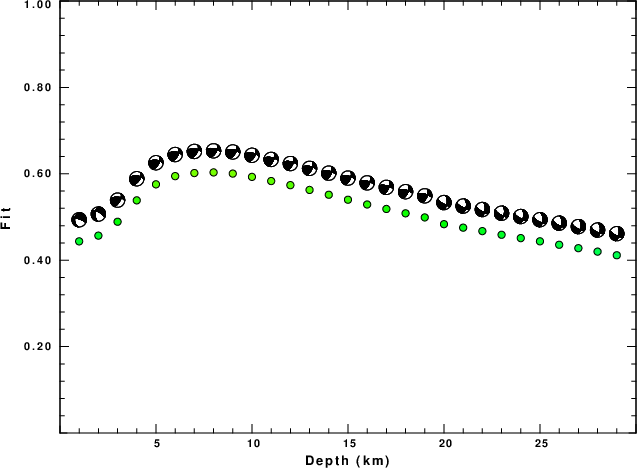 The program wvfgrd96 was used with good traces observed at short distance to determine the focal mechanism, depth and seismic moment. This technique requires a high quality signal and well determined velocity model for the Green's functions. To the extent that these are the quality data, this type of mechanism should be preferred over the radiation pattern technique which requires the separate step of defining the pressure and tension quadrants and the correct strike.