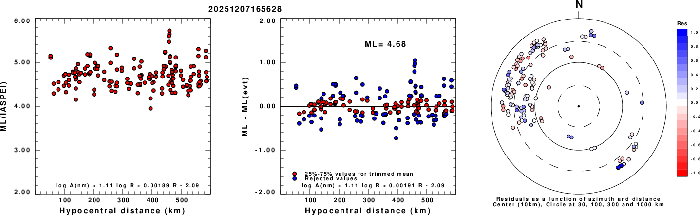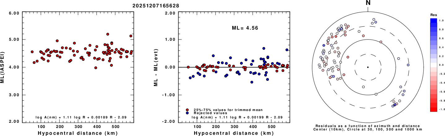 Left: ML computed using the IASPEI formula for Vertical components (research). Center: ML residuals computed using a modified IASPEI formula that accounts for path specific attenuation; the values used for the trimmed mean are indicated. The ML relation used for each figure is given at the bottom of each plot.