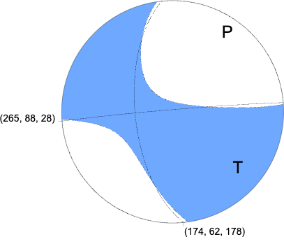 Regional Moment Tensor (Mwr) Moment 8.706e+15 N-m Magnitude 4.56 Mwr Depth 14.0 km Percent DC 73% Half Duration - Catalog US Data Source US Contributor US Nodal Planes Plane Strike Dip Rake NP1 265 88 28 NP2 174 62 178 Principal Axes Axis Value Plunge Azimuth T 8.005e+15 20 133 N 1.262e+15 62 268 P -9.268e+15 18 36 |