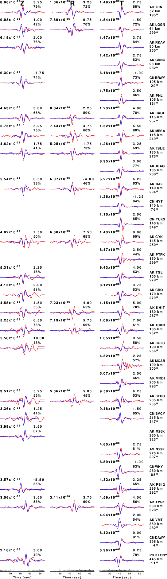 The comparison of the observed and predicted waveforms is given in the next figure. The red traces are the observed and the blue are the predicted. Each observed-predicted component is plotted to the same scale and peak amplitudes are indicated by the numbers to the left of each trace. A pair of numbers is given in black at the right of each predicted traces. The upper number it the time shift required for maximum correlation between the observed and predicted traces. This time shift is required because the synthetics are not computed at exactly the same distance as the observed, the velocity model used in the predictions may not be perfect and the epicentral parameters may be be off. A positive time shift indicates that the prediction is too fast and should be delayed to match the observed trace (shift to the right in this figure). A negative value indicates that the prediction is too slow. The lower number gives the percentage of variance reduction to characterize the individual goodness of fit (100% indicates a perfect fit).