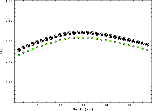 The program wvfgrd96 was used with good traces observed at short distance to determine the focal mechanism, depth and seismic moment. This technique requires a high quality signal and well determined velocity model for the Green's functions. To the extent that these are the quality data, this type of mechanism should be preferred over the radiation pattern technique which requires the separate step of defining the pressure and tension quadrants and the correct strike.
