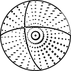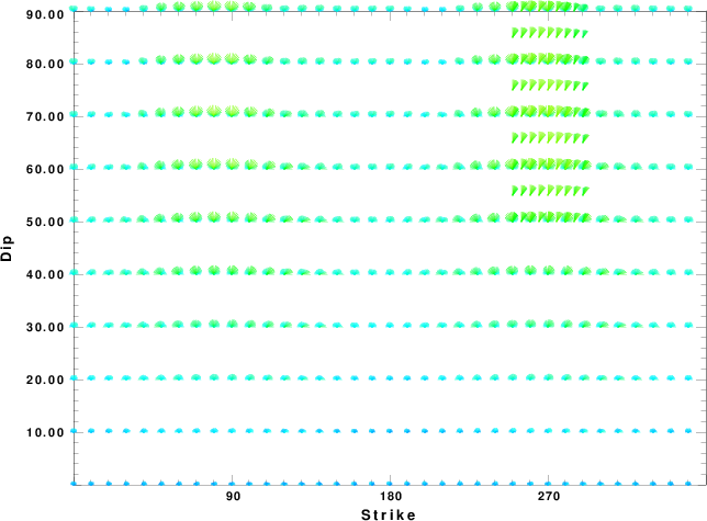 | Focal mechanism sensitivity at the preferred depth. The red color indicates a very good fit to the waveforms. Each solution is plotted as a vector at a given value of strike and dip with the angle of the vector representing the rake angle, measured, with respect to the upward vertical (N) in the figure. |