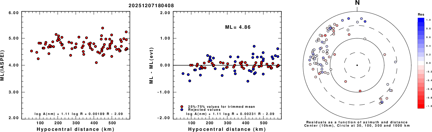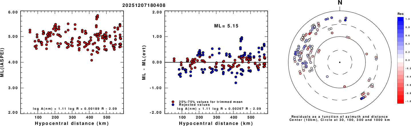 Left: ML computed using the IASPEI formula for Vertical components (research). Center: ML residuals computed using a modified IASPEI formula that accounts for path specific attenuation; the values used for the trimmed mean are indicated. The ML relation used for each figure is given at the bottom of each plot.