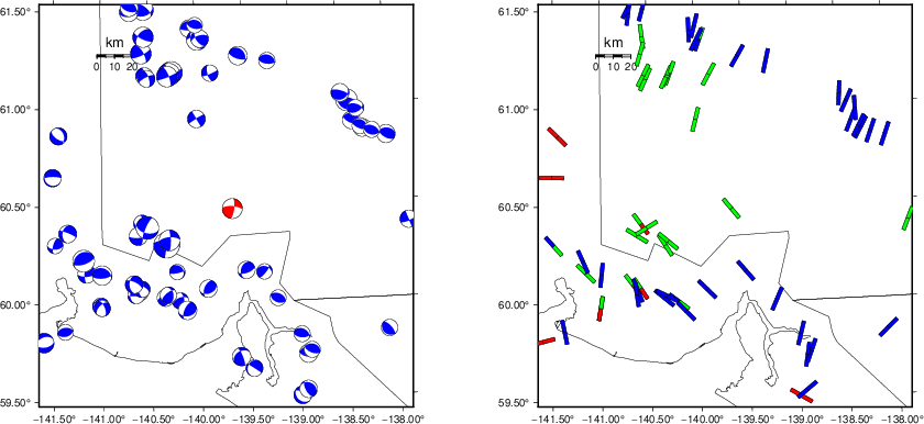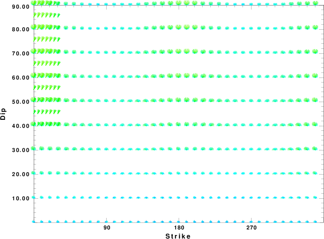 | Focal mechanism sensitivity at the preferred depth. The red color indicates a very good fit to the waveforms. Each solution is plotted as a vector at a given value of strike and dip with the angle of the vector representing the rake angle, measured, with respect to the upward vertical (N) in the figure. |