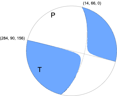 W-phase Moment Tensor (Mww) Moment 9.686e+15 N-m Magnitude 4.59 Mww Depth 11.5 km Percent DC 95% Half Duration 0.50 s Catalog US Data Source US Contributor US Nodal Planes Plane Strike Dip Rake NP1 284 90 156 NP2 14 66 0 Principal Axes Axis Value Plunge Azimuth T 9.805e+15 17 236 N -0.241e+15 66 103 P -9.564e+15 16 331 |