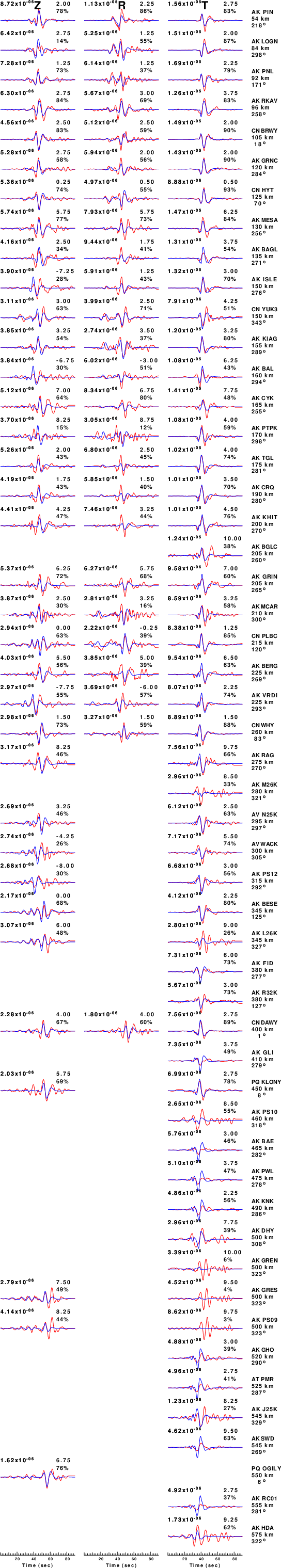 The comparison of the observed and predicted waveforms is given in the next figure. The red traces are the observed and the blue are the predicted. Each observed-predicted component is plotted to the same scale and peak amplitudes are indicated by the numbers to the left of each trace. A pair of numbers is given in black at the right of each predicted traces. The upper number it the time shift required for maximum correlation between the observed and predicted traces. This time shift is required because the synthetics are not computed at exactly the same distance as the observed, the velocity model used in the predictions may not be perfect and the epicentral parameters may be be off. A positive time shift indicates that the prediction is too fast and should be delayed to match the observed trace (shift to the right in this figure). A negative value indicates that the prediction is too slow. The lower number gives the percentage of variance reduction to characterize the individual goodness of fit (100% indicates a perfect fit).