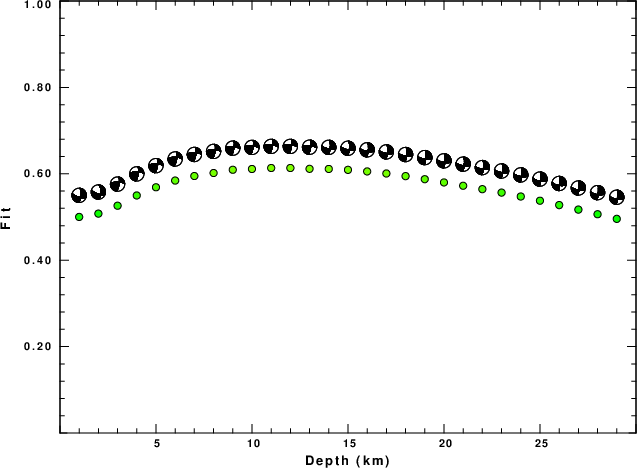 The program wvfgrd96 was used with good traces observed at short distance to determine the focal mechanism, depth and seismic moment. This technique requires a high quality signal and well determined velocity model for the Green's functions. To the extent that these are the quality data, this type of mechanism should be preferred over the radiation pattern technique which requires the separate step of defining the pressure and tension quadrants and the correct strike.