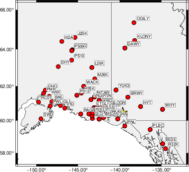 The focal mechanism was determined using broadband seismic waveforms. The location of the event (star) and the stations used for (red) the waveform inversion are shown in the next figure.