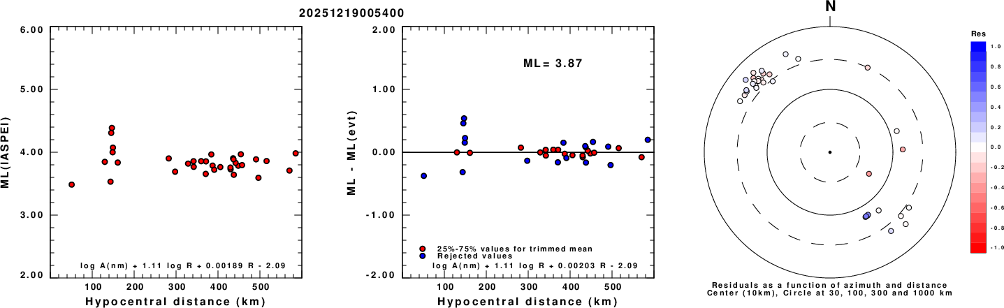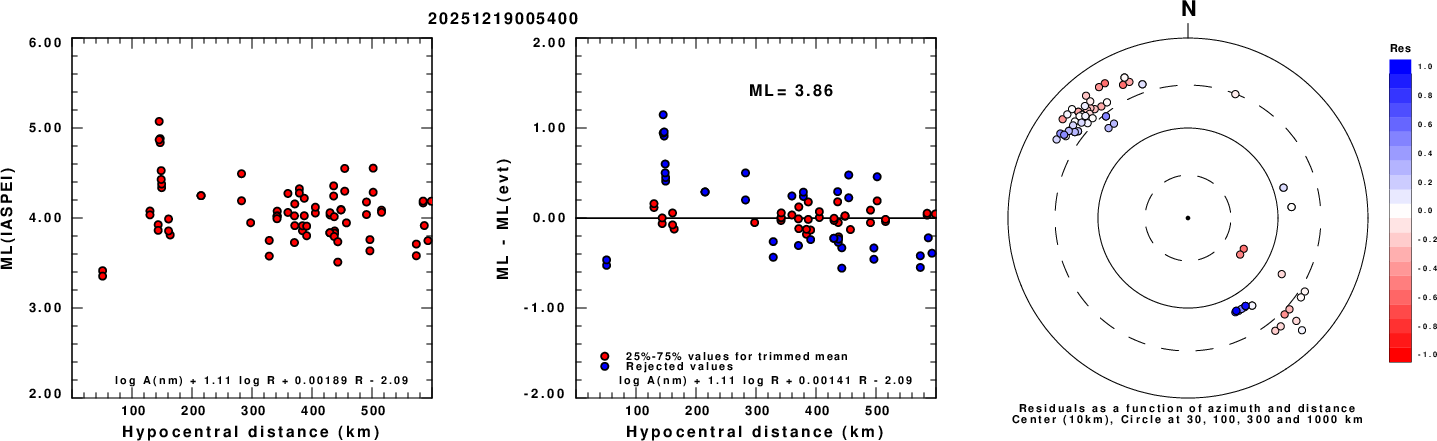 Left: ML computed using the IASPEI formula for Vertical components (research). Center: ML residuals computed using a modified IASPEI formula that accounts for path specific attenuation; the values used for the trimmed mean are indicated. The ML relation used for each figure is given at the bottom of each plot.