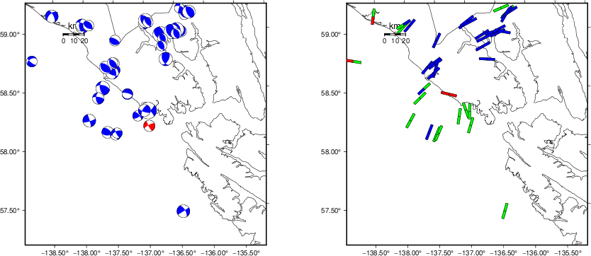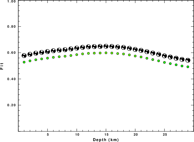 The program wvfgrd96 was used with good traces observed at short distance to determine the focal mechanism, depth and seismic moment. This technique requires a high quality signal and well determined velocity model for the Green's functions. To the extent that these are the quality data, this type of mechanism should be preferred over the radiation pattern technique which requires the separate step of defining the pressure and tension quadrants and the correct strike.