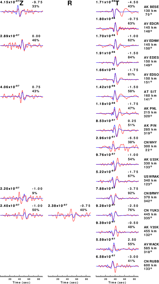 The comparison of the observed and predicted waveforms is given in the next figure. The red traces are the observed and the blue are the predicted. Each observed-predicted component is plotted to the same scale and peak amplitudes are indicated by the numbers to the left of each trace. A pair of numbers is given in black at the right of each predicted traces. The upper number it the time shift required for maximum correlation between the observed and predicted traces. This time shift is required because the synthetics are not computed at exactly the same distance as the observed, the velocity model used in the predictions may not be perfect and the epicentral parameters may be be off. A positive time shift indicates that the prediction is too fast and should be delayed to match the observed trace (shift to the right in this figure). A negative value indicates that the prediction is too slow. The lower number gives the percentage of variance reduction to characterize the individual goodness of fit (100% indicates a perfect fit).