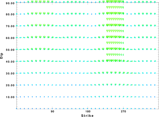 | Focal mechanism sensitivity at the preferred depth. The red color indicates a very good fit to the waveforms. Each solution is plotted as a vector at a given value of strike and dip with the angle of the vector representing the rake angle, measured, with respect to the upward vertical (N) in the figure. |