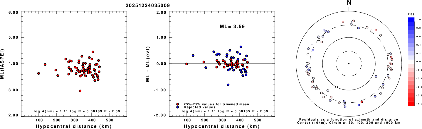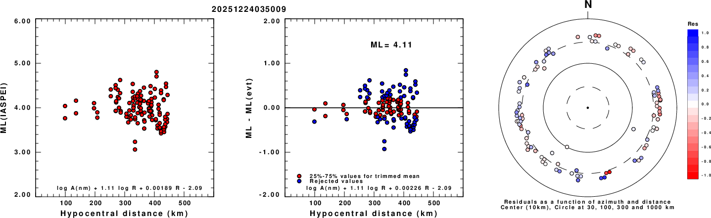 Left: ML computed using the IASPEI formula for Vertical components (research). Center: ML residuals computed using a modified IASPEI formula that accounts for path specific attenuation; the values used for the trimmed mean are indicated. The ML relation used for each figure is given at the bottom of each plot.