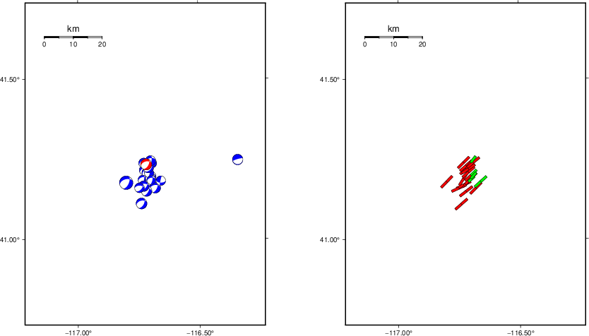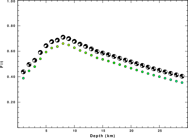 The program wvfgrd96 was used with good traces observed at short distance to determine the focal mechanism, depth and seismic moment. This technique requires a high quality signal and well determined velocity model for the Green's functions. To the extent that these are the quality data, this type of mechanism should be preferred over the radiation pattern technique which requires the separate step of defining the pressure and tension quadrants and the correct strike.