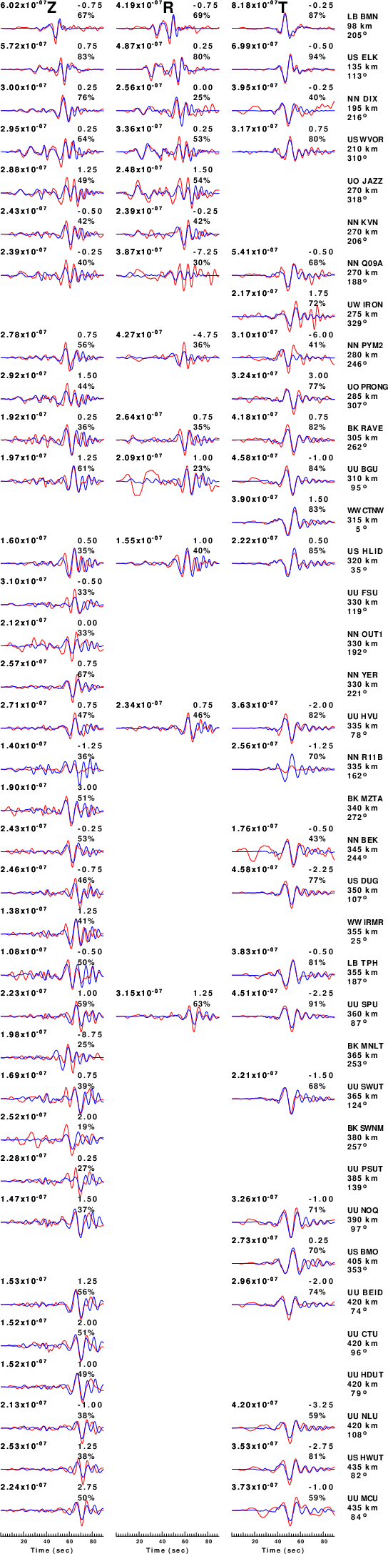 The comparison of the observed and predicted waveforms is given in the next figure. The red traces are the observed and the blue are the predicted. Each observed-predicted component is plotted to the same scale and peak amplitudes are indicated by the numbers to the left of each trace. A pair of numbers is given in black at the right of each predicted traces. The upper number it the time shift required for maximum correlation between the observed and predicted traces. This time shift is required because the synthetics are not computed at exactly the same distance as the observed, the velocity model used in the predictions may not be perfect and the epicentral parameters may be be off. A positive time shift indicates that the prediction is too fast and should be delayed to match the observed trace (shift to the right in this figure). A negative value indicates that the prediction is too slow. The lower number gives the percentage of variance reduction to characterize the individual goodness of fit (100% indicates a perfect fit).