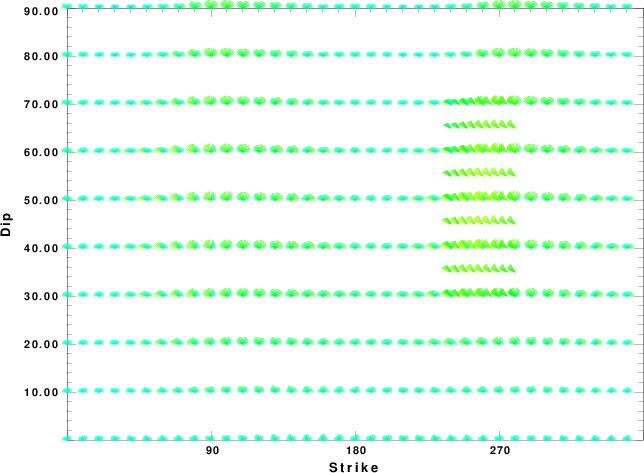 | Focal mechanism sensitivity at the preferred depth. The red color indicates a very good fit to the waveforms. Each solution is plotted as a vector at a given value of strike and dip with the angle of the vector representing the rake angle, measured, with respect to the upward vertical (N) in the figure. |