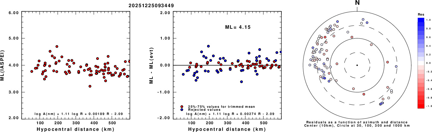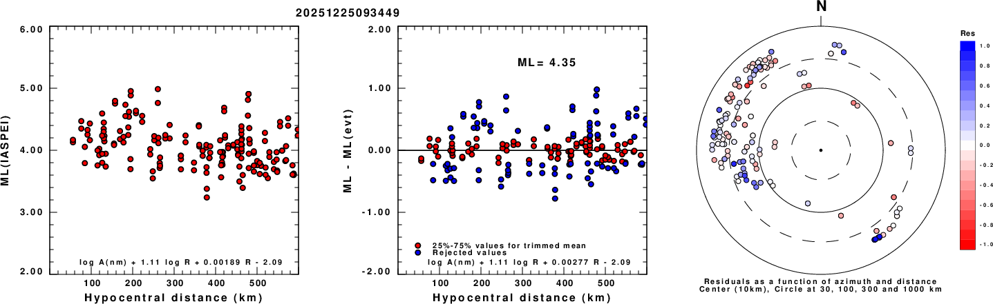 Left: ML computed using the IASPEI formula for Vertical components (research). Center: ML residuals computed using a modified IASPEI formula that accounts for path specific attenuation; the values used for the trimmed mean are indicated. The ML relation used for each figure is given at the bottom of each plot.