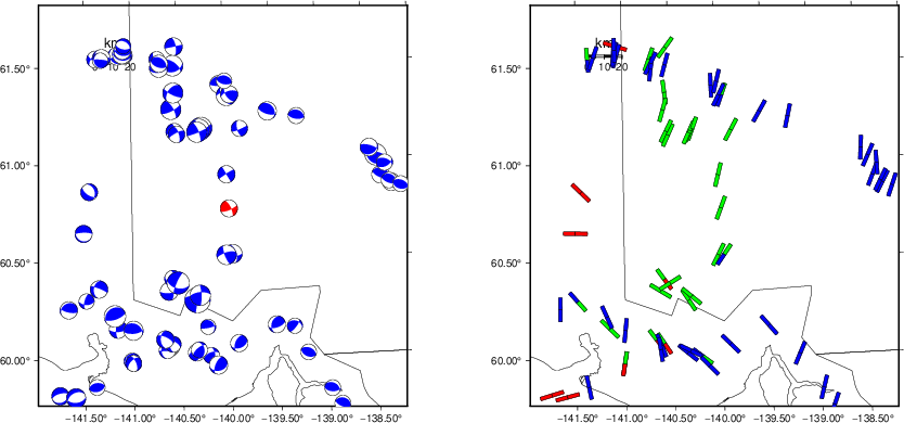 | Focal mechanism sensitivity at the preferred depth. The red color indicates a very good fit to the waveforms. Each solution is plotted as a vector at a given value of strike and dip with the angle of the vector representing the rake angle, measured, with respect to the upward vertical (N) in the figure. |