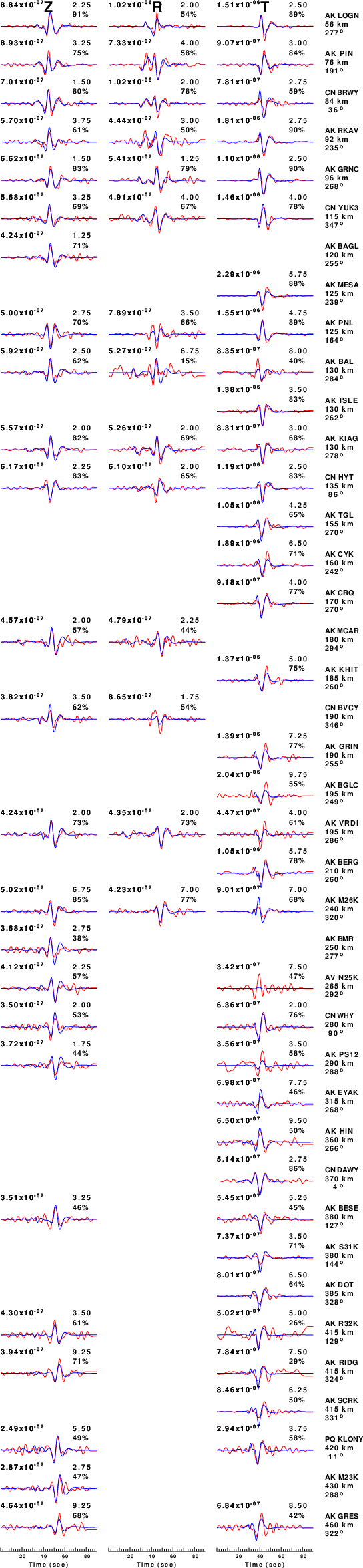 The comparison of the observed and predicted waveforms is given in the next figure. The red traces are the observed and the blue are the predicted. Each observed-predicted component is plotted to the same scale and peak amplitudes are indicated by the numbers to the left of each trace. A pair of numbers is given in black at the right of each predicted traces. The upper number it the time shift required for maximum correlation between the observed and predicted traces. This time shift is required because the synthetics are not computed at exactly the same distance as the observed, the velocity model used in the predictions may not be perfect and the epicentral parameters may be be off. A positive time shift indicates that the prediction is too fast and should be delayed to match the observed trace (shift to the right in this figure). A negative value indicates that the prediction is too slow. The lower number gives the percentage of variance reduction to characterize the individual goodness of fit (100% indicates a perfect fit).