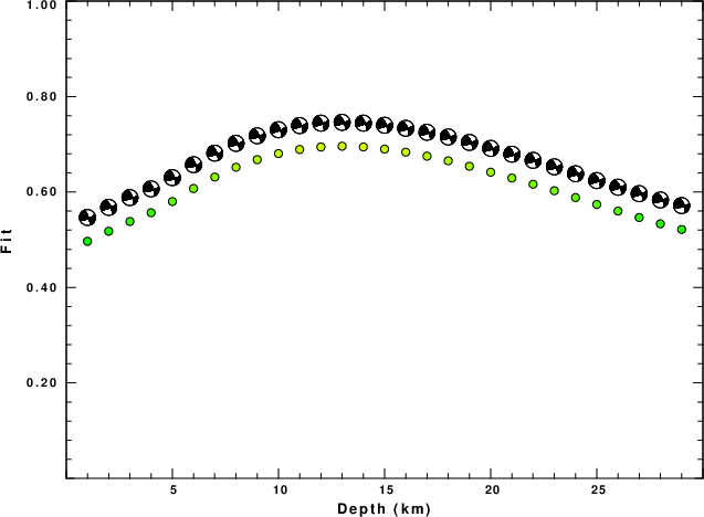 The program wvfgrd96 was used with good traces observed at short distance to determine the focal mechanism, depth and seismic moment. This technique requires a high quality signal and well determined velocity model for the Green's functions. To the extent that these are the quality data, this type of mechanism should be preferred over the radiation pattern technique which requires the separate step of defining the pressure and tension quadrants and the correct strike.