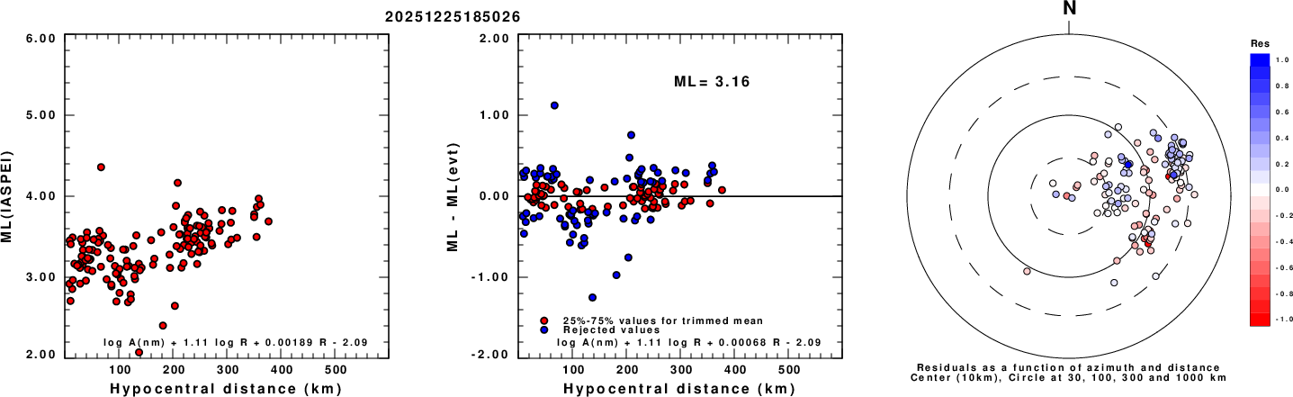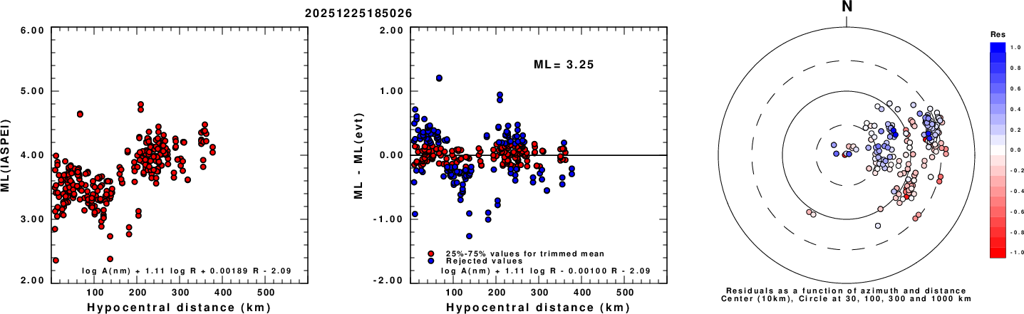 Left: ML computed using the IASPEI formula for Vertical components (research). Center: ML residuals computed using a modified IASPEI formula that accounts for path specific attenuation; the values used for the trimmed mean are indicated. The ML relation used for each figure is given at the bottom of each plot.