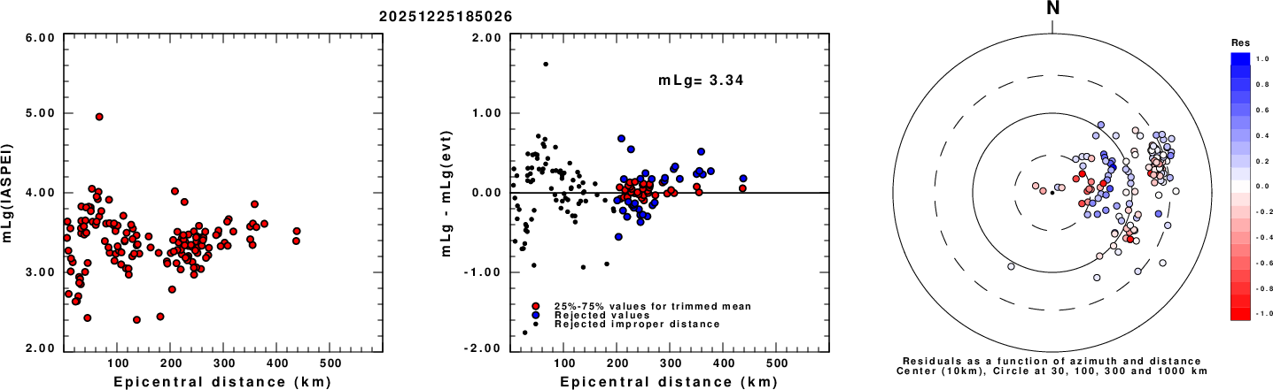 Left: mLg computed using the IASPEI formula. Center: mLg residuals versus epicentral distance ; the values used for the trimmed mean magnitude estimate are indicated.