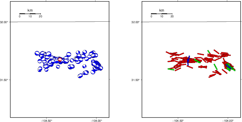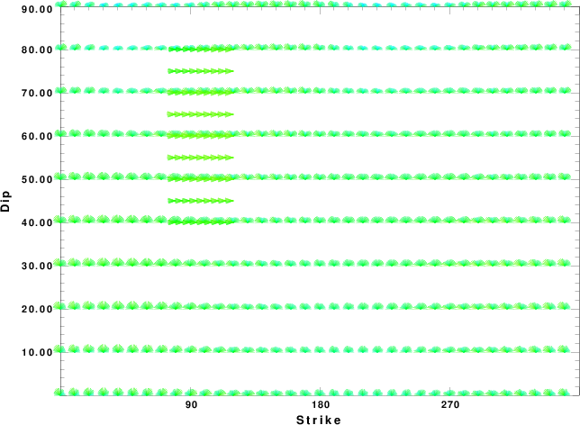 | Focal mechanism sensitivity at the preferred depth. The red color indicates a very good fit to the waveforms. Each solution is plotted as a vector at a given value of strike and dip with the angle of the vector representing the rake angle, measured, with respect to the upward vertical (N) in the figure. |