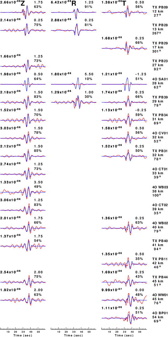 The comparison of the observed and predicted waveforms is given in the next figure. The red traces are the observed and the blue are the predicted. Each observed-predicted component is plotted to the same scale and peak amplitudes are indicated by the numbers to the left of each trace. A pair of numbers is given in black at the right of each predicted traces. The upper number it the time shift required for maximum correlation between the observed and predicted traces. This time shift is required because the synthetics are not computed at exactly the same distance as the observed, the velocity model used in the predictions may not be perfect and the epicentral parameters may be be off. A positive time shift indicates that the prediction is too fast and should be delayed to match the observed trace (shift to the right in this figure). A negative value indicates that the prediction is too slow. The lower number gives the percentage of variance reduction to characterize the individual goodness of fit (100% indicates a perfect fit).