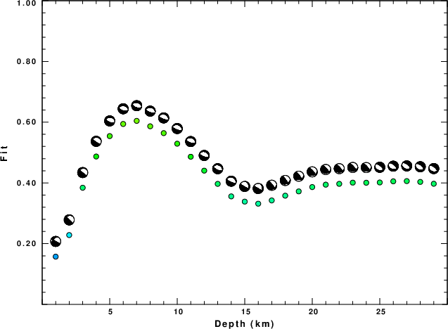 The program wvfgrd96 was used with good traces observed at short distance to determine the focal mechanism, depth and seismic moment. This technique requires a high quality signal and well determined velocity model for the Green's functions. To the extent that these are the quality data, this type of mechanism should be preferred over the radiation pattern technique which requires the separate step of defining the pressure and tension quadrants and the correct strike.