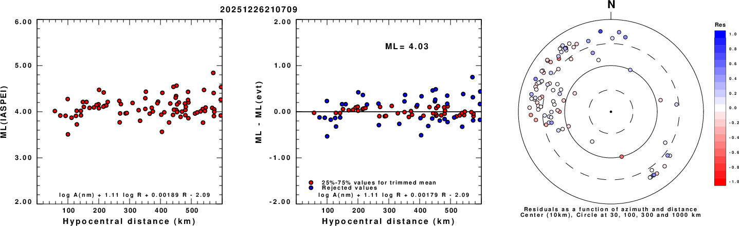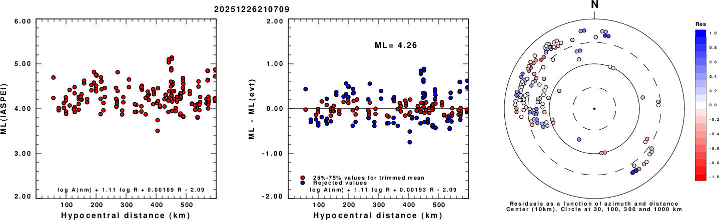 Left: ML computed using the IASPEI formula for Vertical components (research). Center: ML residuals computed using a modified IASPEI formula that accounts for path specific attenuation; the values used for the trimmed mean are indicated. The ML relation used for each figure is given at the bottom of each plot.
