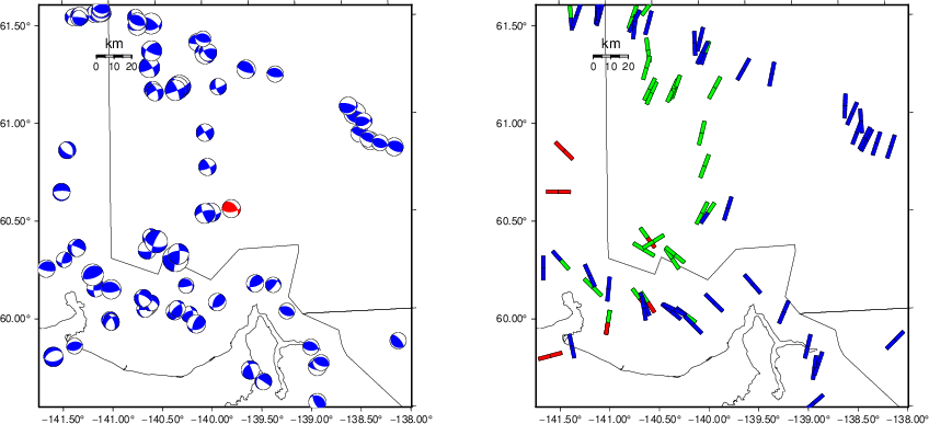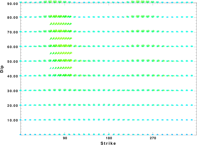 | Focal mechanism sensitivity at the preferred depth. The red color indicates a very good fit to the waveforms. Each solution is plotted as a vector at a given value of strike and dip with the angle of the vector representing the rake angle, measured, with respect to the upward vertical (N) in the figure. |