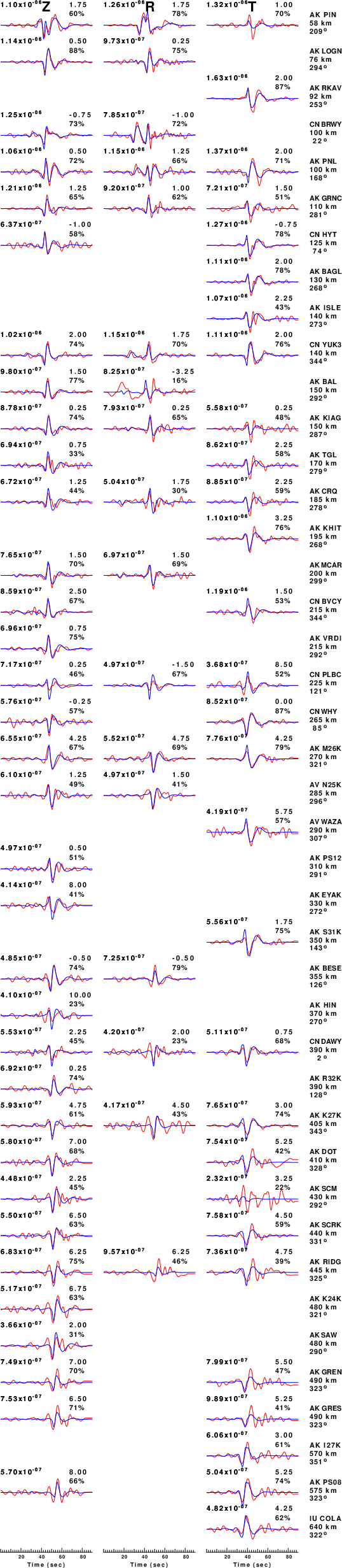 The comparison of the observed and predicted waveforms is given in the next figure. The red traces are the observed and the blue are the predicted. Each observed-predicted component is plotted to the same scale and peak amplitudes are indicated by the numbers to the left of each trace. A pair of numbers is given in black at the right of each predicted traces. The upper number it the time shift required for maximum correlation between the observed and predicted traces. This time shift is required because the synthetics are not computed at exactly the same distance as the observed, the velocity model used in the predictions may not be perfect and the epicentral parameters may be be off. A positive time shift indicates that the prediction is too fast and should be delayed to match the observed trace (shift to the right in this figure). A negative value indicates that the prediction is too slow. The lower number gives the percentage of variance reduction to characterize the individual goodness of fit (100% indicates a perfect fit).