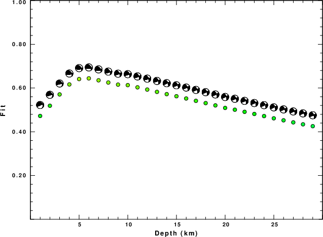 The program wvfgrd96 was used with good traces observed at short distance to determine the focal mechanism, depth and seismic moment. This technique requires a high quality signal and well determined velocity model for the Green's functions. To the extent that these are the quality data, this type of mechanism should be preferred over the radiation pattern technique which requires the separate step of defining the pressure and tension quadrants and the correct strike.