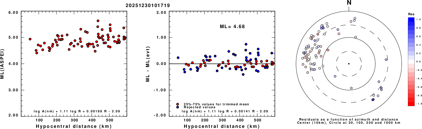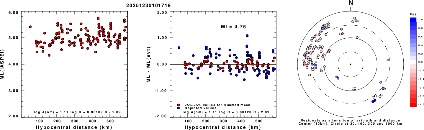 Left: ML computed using the IASPEI formula for Vertical components (research). Center: ML residuals computed using a modified IASPEI formula that accounts for path specific attenuation; the values used for the trimmed mean are indicated. The ML relation used for each figure is given at the bottom of each plot.