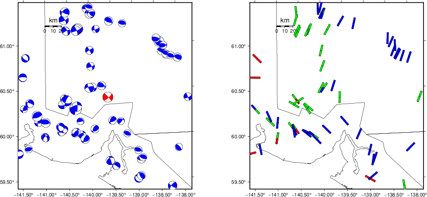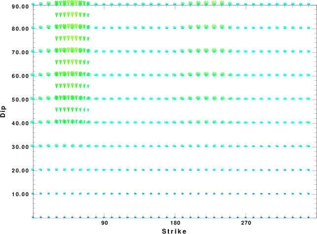 | Focal mechanism sensitivity at the preferred depth. The red color indicates a very good fit to the waveforms. Each solution is plotted as a vector at a given value of strike and dip with the angle of the vector representing the rake angle, measured, with respect to the upward vertical (N) in the figure. |