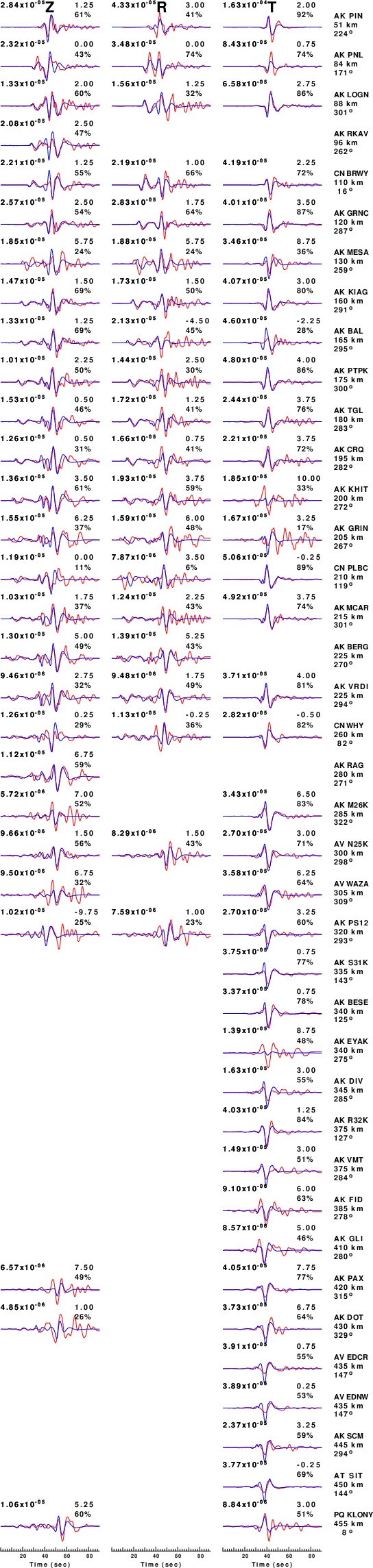 The comparison of the observed and predicted waveforms is given in the next figure. The red traces are the observed and the blue are the predicted. Each observed-predicted component is plotted to the same scale and peak amplitudes are indicated by the numbers to the left of each trace. A pair of numbers is given in black at the right of each predicted traces. The upper number it the time shift required for maximum correlation between the observed and predicted traces. This time shift is required because the synthetics are not computed at exactly the same distance as the observed, the velocity model used in the predictions may not be perfect and the epicentral parameters may be be off. A positive time shift indicates that the prediction is too fast and should be delayed to match the observed trace (shift to the right in this figure). A negative value indicates that the prediction is too slow. The lower number gives the percentage of variance reduction to characterize the individual goodness of fit (100% indicates a perfect fit).
