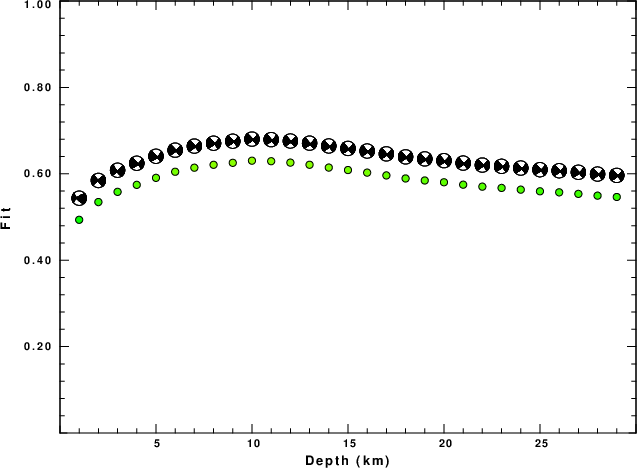 The program wvfgrd96 was used with good traces observed at short distance to determine the focal mechanism, depth and seismic moment. This technique requires a high quality signal and well determined velocity model for the Green's functions. To the extent that these are the quality data, this type of mechanism should be preferred over the radiation pattern technique which requires the separate step of defining the pressure and tension quadrants and the correct strike.
