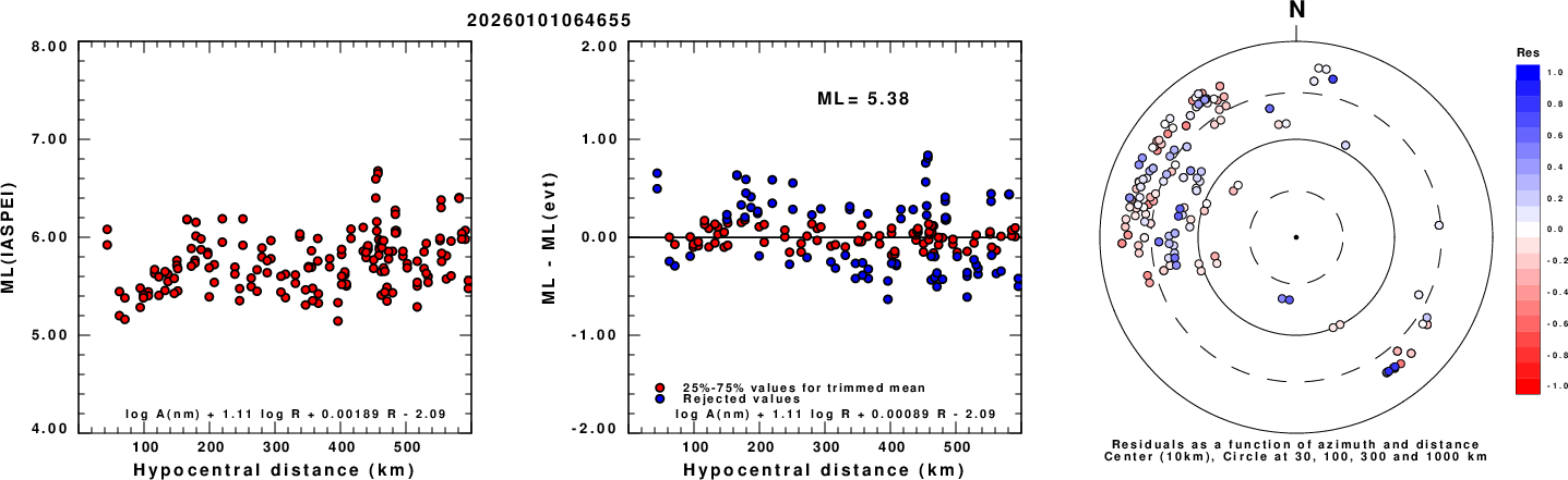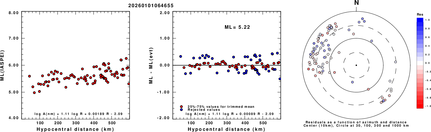 Given the availability of digital waveforms for determination of the moment tensor, this section documents the added processing leading to mLg, if appropriate to the region, and ML by application of the respective IASPEI formulae. As a research study, the linear distance term of the IASPEI formula for ML is adjusted to remove a linear distance trend in residuals to give a regionally defined ML. The defined ML uses horizontal component recordings, but the same procedure is applied to the vertical components since there may be some interest in vertical component ground motions. Residual plots versus distance may indicate interesting features of ground motion scaling in some distance ranges. A residual plot of the regionalized magnitude is given as a function of distance and azimuth, since data sets may transcend different wave propagation provinces.