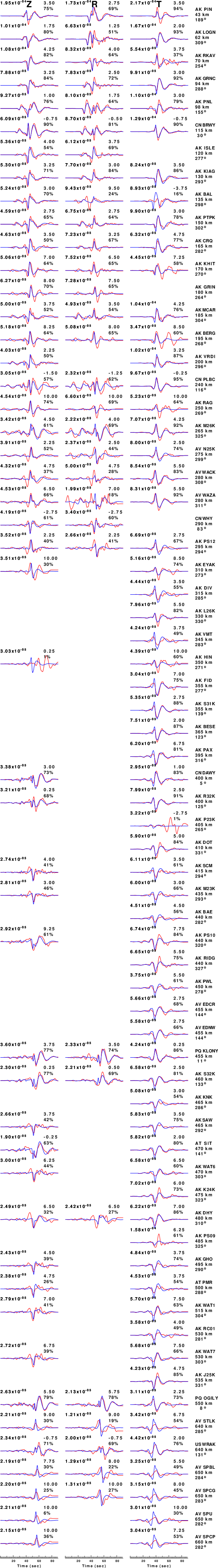 The comparison of the observed and predicted waveforms is given in the next figure. The red traces are the observed and the blue are the predicted. Each observed-predicted component is plotted to the same scale and peak amplitudes are indicated by the numbers to the left of each trace. A pair of numbers is given in black at the right of each predicted traces. The upper number it the time shift required for maximum correlation between the observed and predicted traces. This time shift is required because the synthetics are not computed at exactly the same distance as the observed, the velocity model used in the predictions may not be perfect and the epicentral parameters may be be off. A positive time shift indicates that the prediction is too fast and should be delayed to match the observed trace (shift to the right in this figure). A negative value indicates that the prediction is too slow. The lower number gives the percentage of variance reduction to characterize the individual goodness of fit (100% indicates a perfect fit).