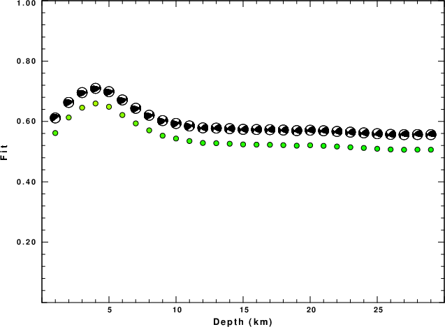 The program wvfgrd96 was used with good traces observed at short distance to determine the focal mechanism, depth and seismic moment. This technique requires a high quality signal and well determined velocity model for the Green's functions. To the extent that these are the quality data, this type of mechanism should be preferred over the radiation pattern technique which requires the separate step of defining the pressure and tension quadrants and the correct strike.