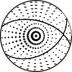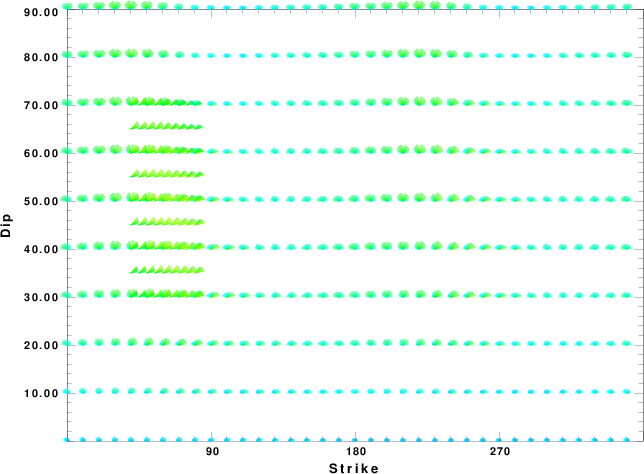| Focal mechanism sensitivity at the preferred depth. The red color indicates a very good fit to the waveforms. Each solution is plotted as a vector at a given value of strike and dip with the angle of the vector representing the rake angle, measured, with respect to the upward vertical (N) in the figure. |
