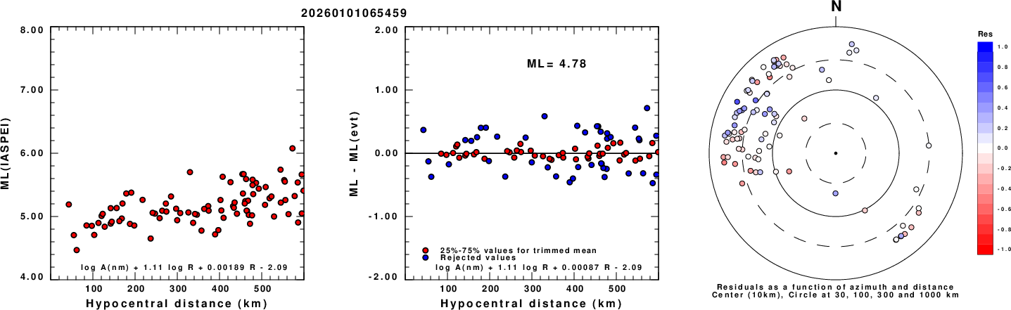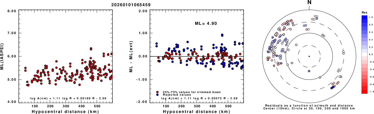 Left: ML computed using the IASPEI formula for Vertical components (research). Center: ML residuals computed using a modified IASPEI formula that accounts for path specific attenuation; the values used for the trimmed mean are indicated. The ML relation used for each figure is given at the bottom of each plot.