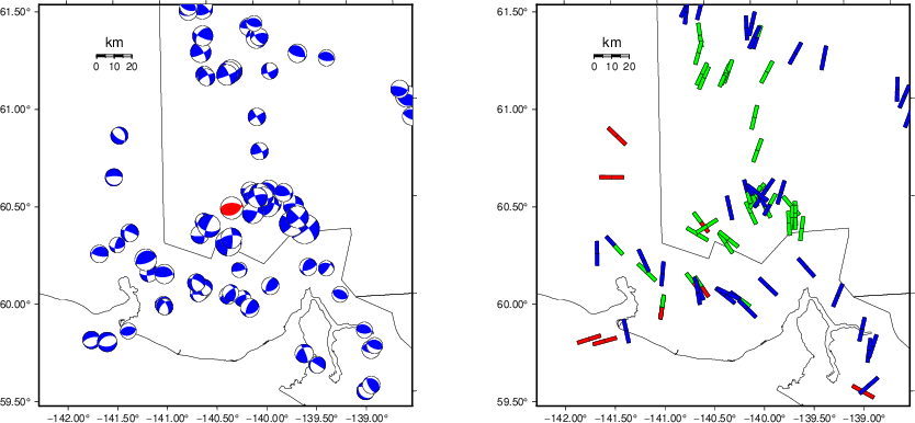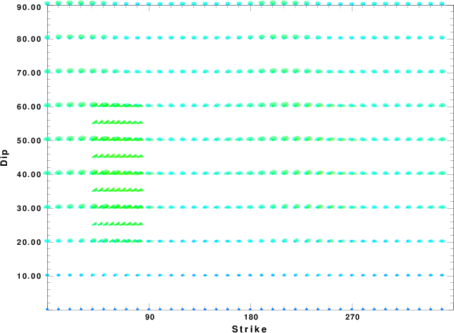 | Focal mechanism sensitivity at the preferred depth. The red color indicates a very good fit to the waveforms. Each solution is plotted as a vector at a given value of strike and dip with the angle of the vector representing the rake angle, measured, with respect to the upward vertical (N) in the figure. |