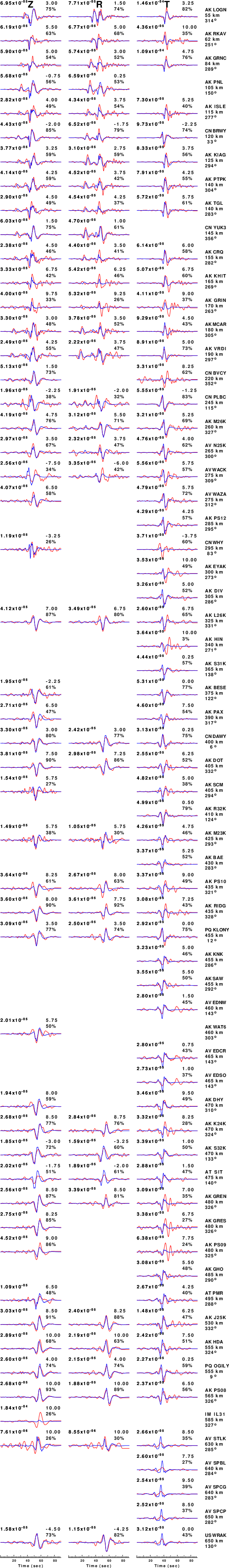 The comparison of the observed and predicted waveforms is given in the next figure. The red traces are the observed and the blue are the predicted. Each observed-predicted component is plotted to the same scale and peak amplitudes are indicated by the numbers to the left of each trace. A pair of numbers is given in black at the right of each predicted traces. The upper number it the time shift required for maximum correlation between the observed and predicted traces. This time shift is required because the synthetics are not computed at exactly the same distance as the observed, the velocity model used in the predictions may not be perfect and the epicentral parameters may be be off. A positive time shift indicates that the prediction is too fast and should be delayed to match the observed trace (shift to the right in this figure). A negative value indicates that the prediction is too slow. The lower number gives the percentage of variance reduction to characterize the individual goodness of fit (100% indicates a perfect fit).