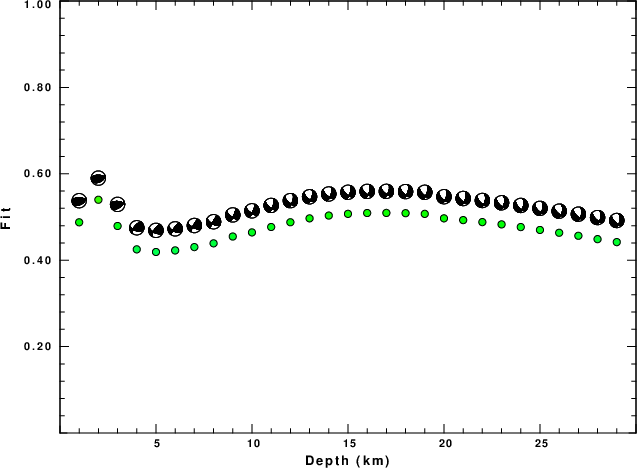 The program wvfgrd96 was used with good traces observed at short distance to determine the focal mechanism, depth and seismic moment. This technique requires a high quality signal and well determined velocity model for the Green's functions. To the extent that these are the quality data, this type of mechanism should be preferred over the radiation pattern technique which requires the separate step of defining the pressure and tension quadrants and the correct strike.