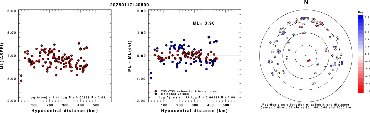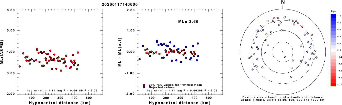 Left: ML computed using the IASPEI formula for Vertical components (research). Center: ML residuals computed using a modified IASPEI formula that accounts for path specific attenuation; the values used for the trimmed mean are indicated. The ML relation used for each figure is given at the bottom of each plot.