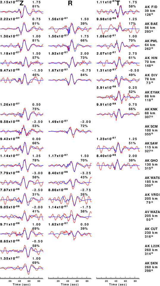 The comparison of the observed and predicted waveforms is given in the next figure. The red traces are the observed and the blue are the predicted. Each observed-predicted component is plotted to the same scale and peak amplitudes are indicated by the numbers to the left of each trace. A pair of numbers is given in black at the right of each predicted traces. The upper number it the time shift required for maximum correlation between the observed and predicted traces. This time shift is required because the synthetics are not computed at exactly the same distance as the observed, the velocity model used in the predictions may not be perfect and the epicentral parameters may be be off. A positive time shift indicates that the prediction is too fast and should be delayed to match the observed trace (shift to the right in this figure). A negative value indicates that the prediction is too slow. The lower number gives the percentage of variance reduction to characterize the individual goodness of fit (100% indicates a perfect fit).